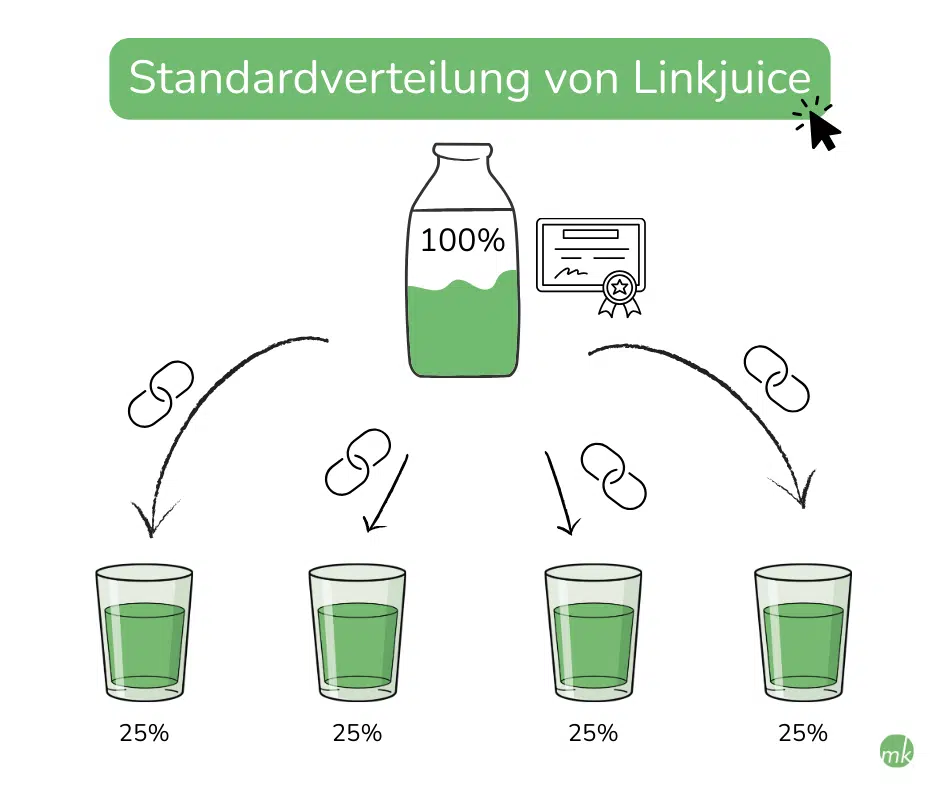 Linkjuice beschreibt den „Wert“ oder die Kraft, die ein Link von einer Seite auf eine andere überträgt. Wenn eine Website auf deine Website verlinkt, gibt sie einen Teil ihrer Autorität und Vertrauenswürdigkeit weiter. Je höher die Qualität der verlinkenden Seite ist, desto mehr Linkjuice fließt zu deiner Seite.